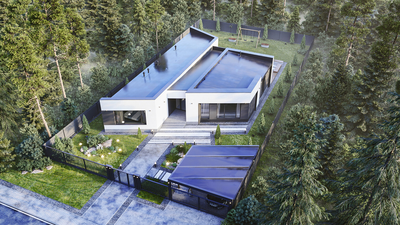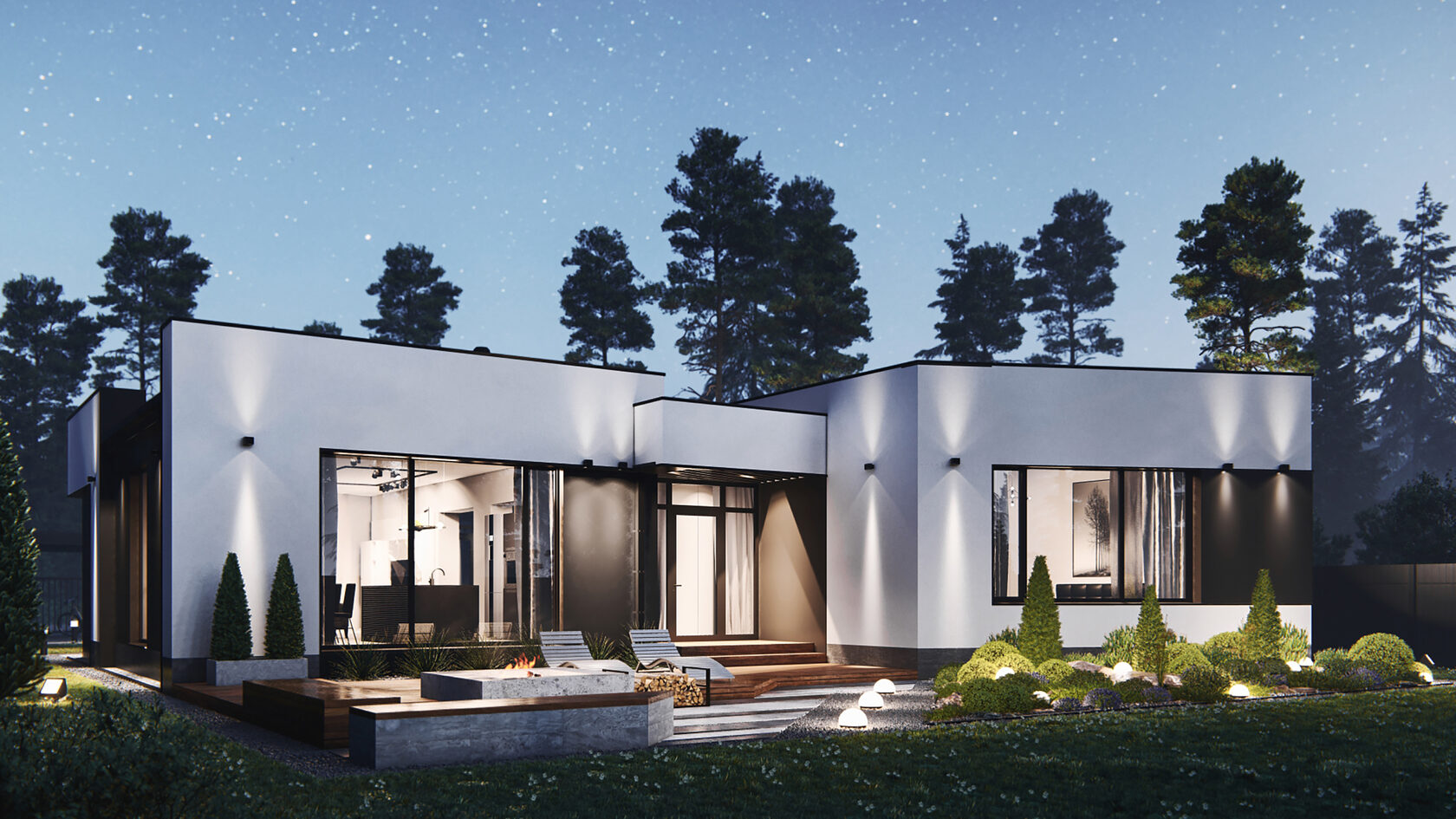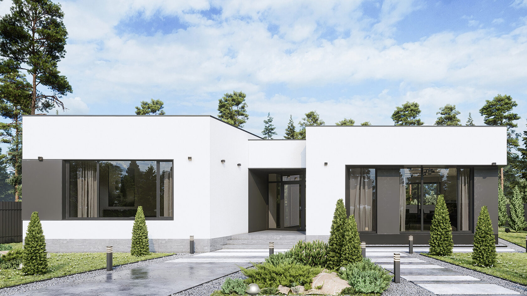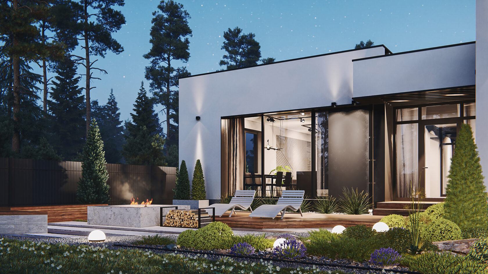 Большая площадь кухни-гостиной дает ощущение свободы. Четкое разделение ночной и дневной зоны позволяет скрыть приватную жизнь дома. Панорамное остекление гарантирует естественное освещение