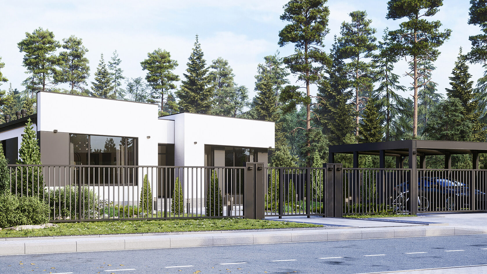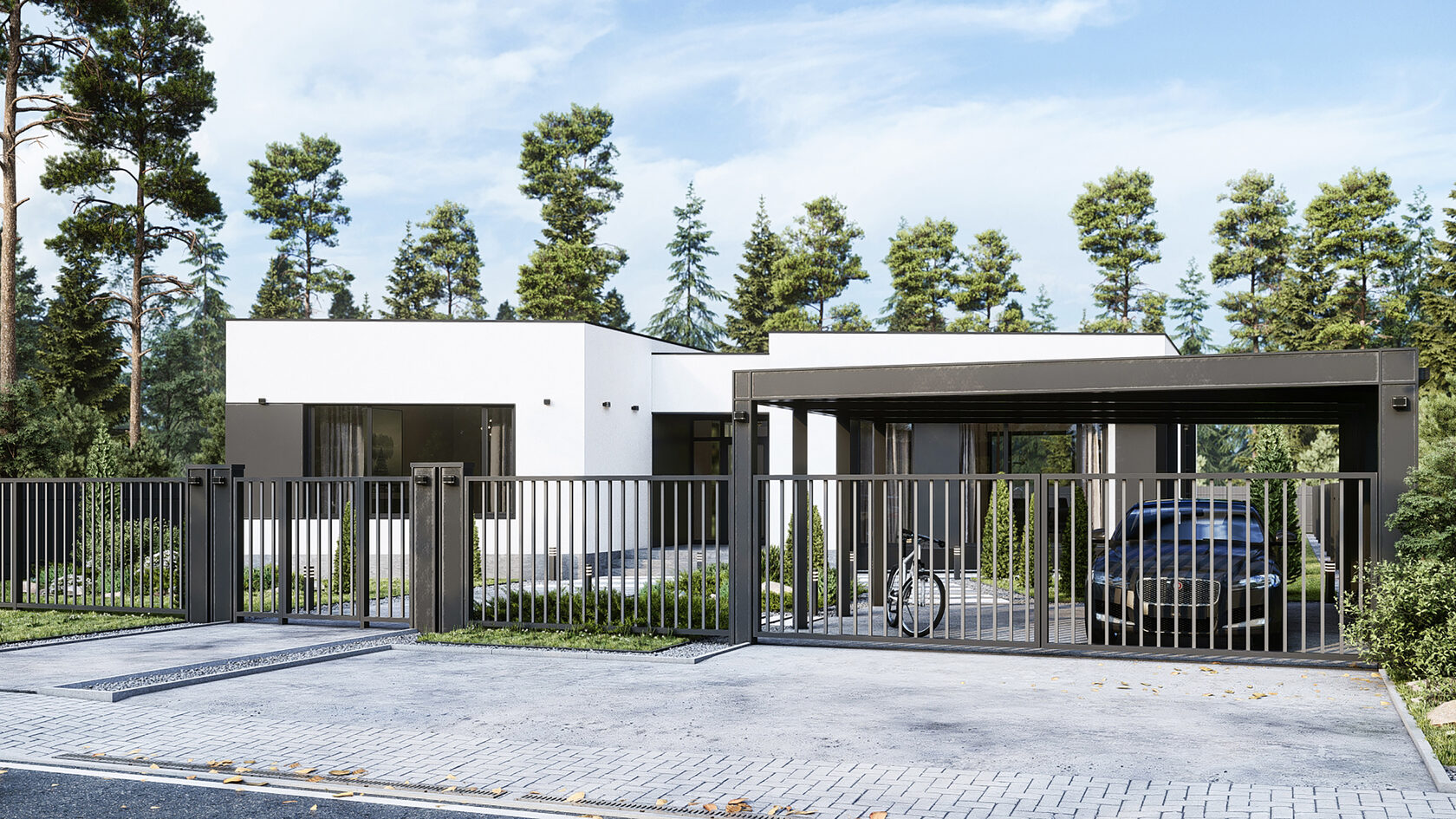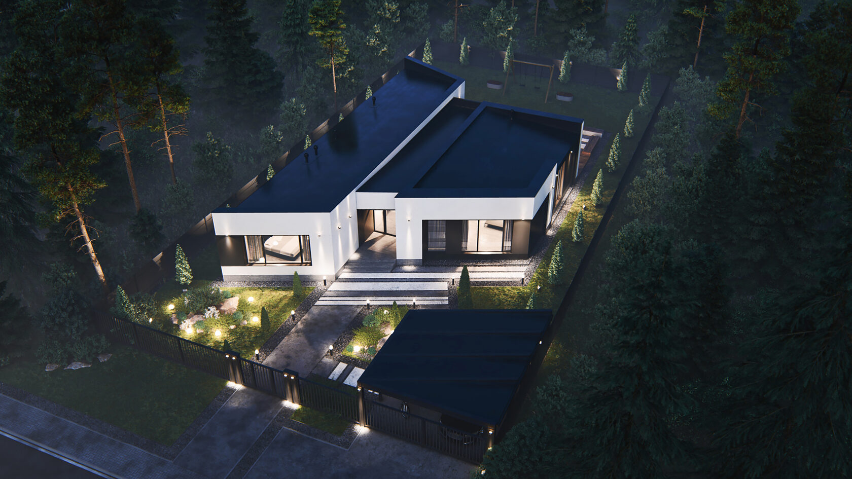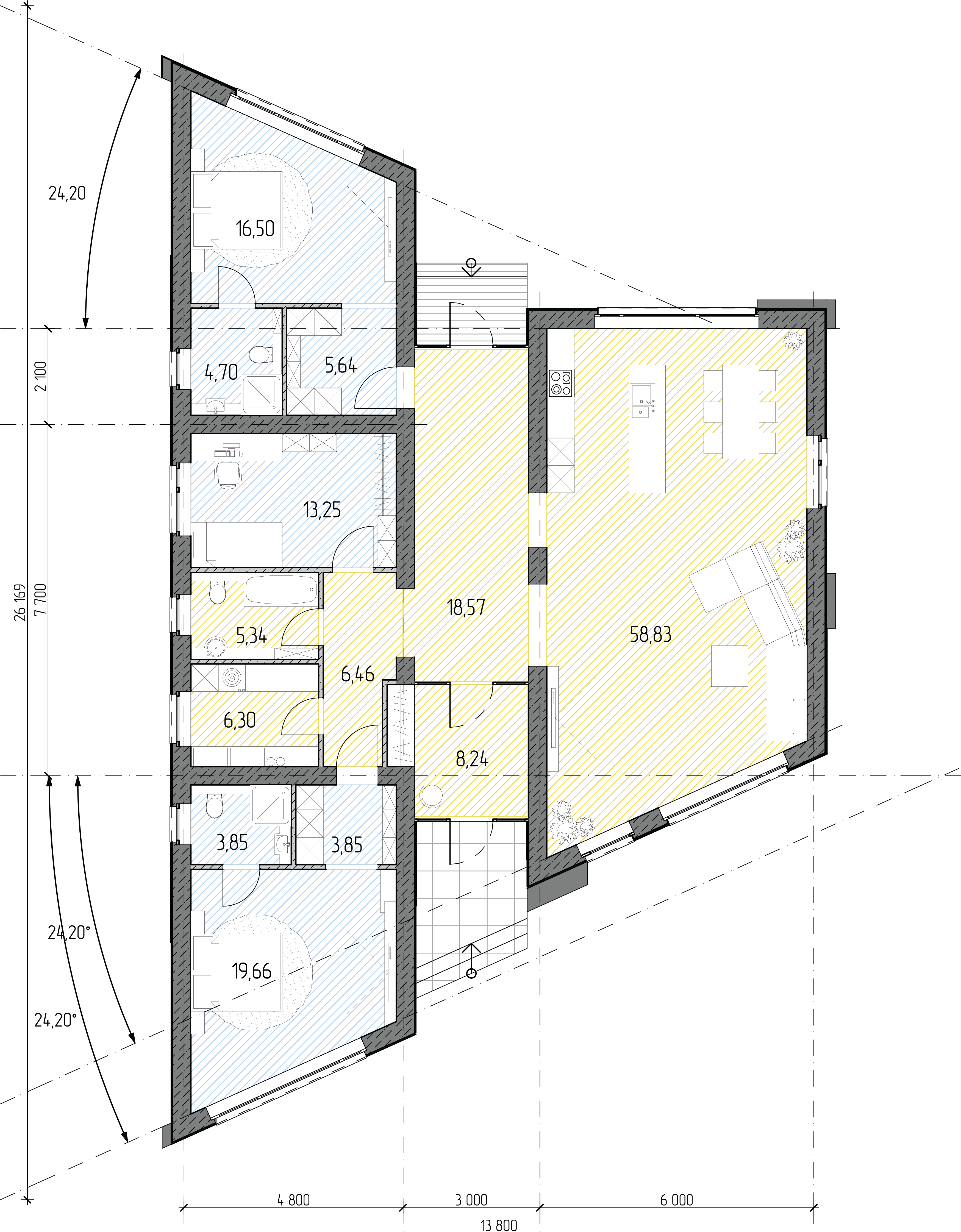 Большая площадь кухни-гостиной дает ощущение свободы. Четкое разделение ночной и дневной зоны позволяет скрыть приватную жизнь дома. Панорамное остекление гарантирует естественное освещение